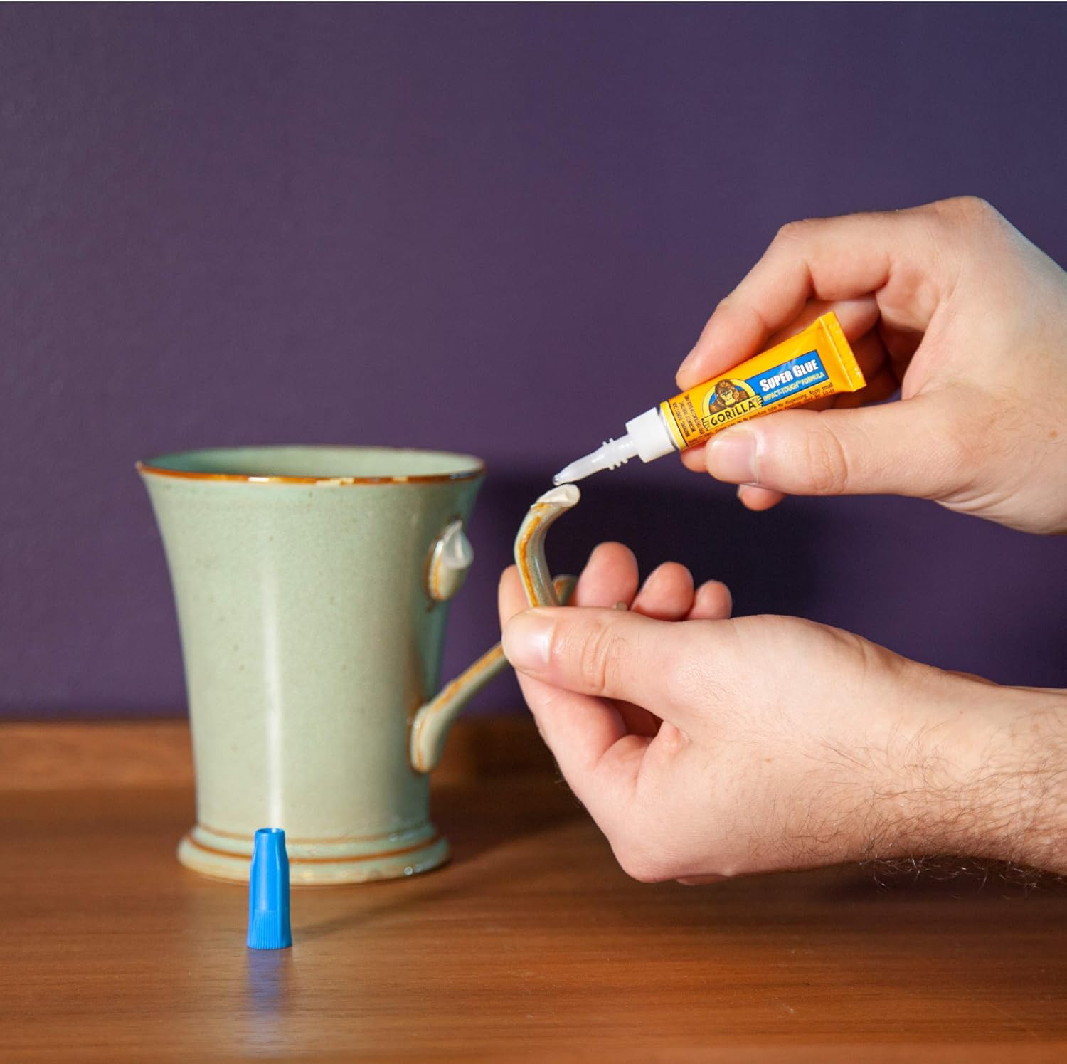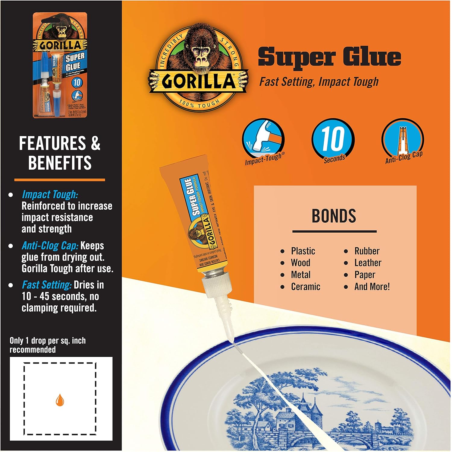 Its high strength and quick set time make Gorilla Super Glue the go-to adhesive for a variety of household projects. Developed for long-lasting repairs in an instant, the clear glue dries in 10-45 seconds. Our Super Glue is reinforced for increased impact resistance to handle bumps and drops. We call it Impact-Tough® because the reliable bond stands up to wear and tear. Super glue, also referred to as cyanoacrylate glue, or CA glue, works on a variety of materials, including plastic*, metal, stone, ceramic, paper, rubber and more. In addition to Gorilla Super Glue's high-performance cyanoacrylate formula, we've added an anti-clog cap with a metal pin inside ensuring an airtight seal for maximum reusability. It's Gorilla tough, every time. *Not recommended for use on polyethylene or polypropylene plastic or similar materials. Directions: 1) Protect Work Area From Spills 2) Clean and Dry Surfaces to Be Bonded 3) Apply Gorilla Super Glue: Apply a small amount of Gorilla Super Glue to one surface. Excess glue can cause delayed or failed bond. One drop of super glue covers one square inch. 4) Secure: Press the two surfaces together for about 10-45 seconds. Note that gaps and uneven surfaces may cause delayed bonding. Wait 24 hours for a full cure.